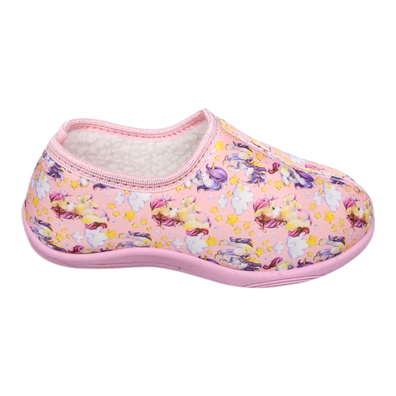 Pantufla infantil con diseo estampado de unicornios, interior abrigado y suela liviana para uso hogareo.