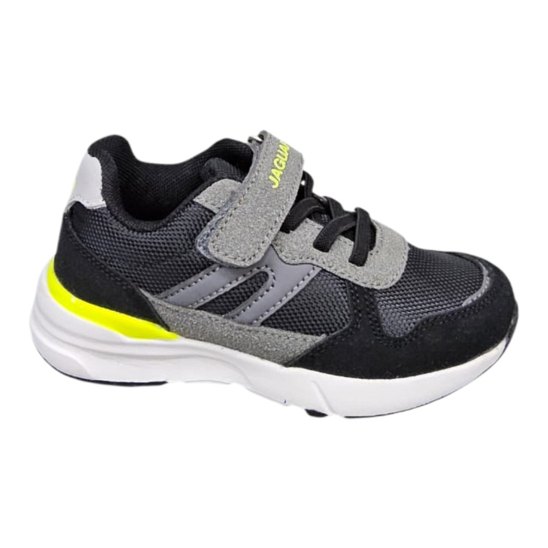 Zapatilla Jaguar infantil con capellada textil y refuerzos sintéticos. Suela liviana con buena amortiguación para brindar comodidad en uso diario y actividades escolares.